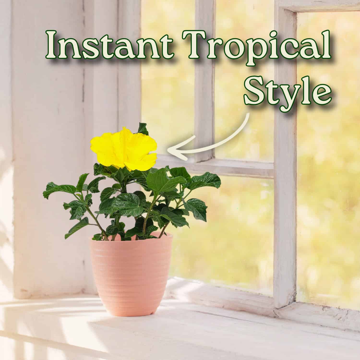 Potted plant with yellow flowers on a windowsill, text 'Instant Tropical Style' above. #size_1-gallon